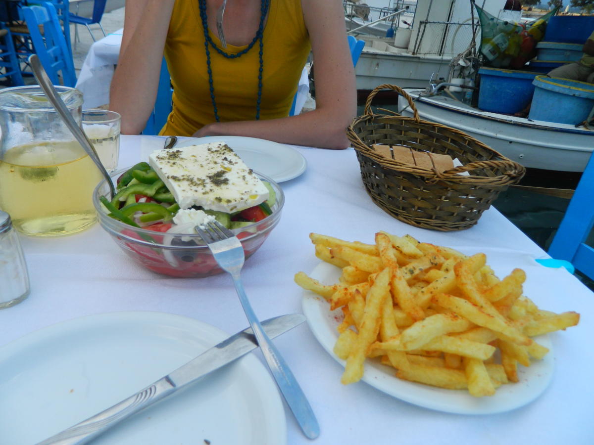 In the evening, go for a walk in the main road and have dinner in one of this tavernas with romantic atmosphere. In particular, we recommend one taverna called Poulos. The menu is a more elaborated and modern version of traditional Greek specialities, offering lots of interesting options for vegetarians, who unfortunately may face some difficulties due to the typically meat-based Greek cuisine. Service and prices are great. We paid less than 20 euros in total and tucked into a beetroot salad (delicious!), fried zucchini with a special yogurt sauce, ntolmadakia (grape leaves stuffed with rice), saganaki (fried Greek cheese), and -of course- a half litre of house, white Greek wine.